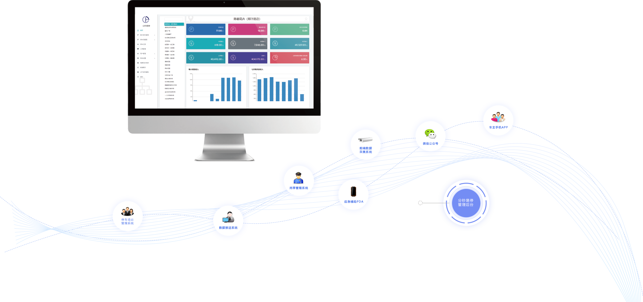 公司自主研发停车管理平台,与微信公众号、小程序、APP等终端平台连接,实现无人值守停车场收费管理。根据各停车场每日进出数据,可生成并导出表格,为大数据分析做基础数据收集。